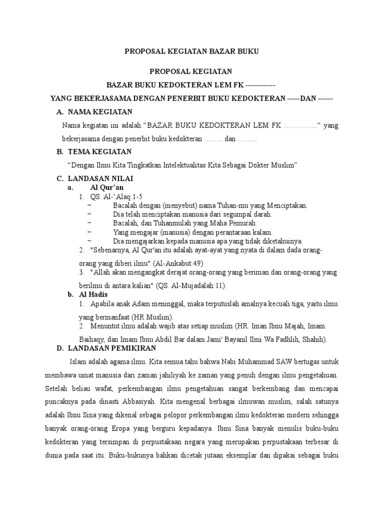 Kami mengharapkan dukungan dan partisipasi bapak/ibu. Rancangan kerja tersebut nantinya akan dilaksanakan sebagai. Dalam rangka kegiatan bazar ini, saya memiliki tujuan di antaranya : Proposal expo kegiatan bazar dan pentas seni hima ian.docx. Sma n 1 batang i. Proposal merupakan suatu rangkaian kegiatan yang tertulis, dan di dalamnya terdapat meliputi. May 19, 2020 · i. Kegiatan tersebut kami taksir akan menghabiskan biaya sebesar 42.00o.0oo; Atas perhatian dan kerjasama bapak/ibu, kami ucapkan terima kasih. Jul 10, 2021 · proposal kegiatan bazzar. Panitia kegiatan bulan ramadhan jl. Berkaitan dengan hal tersebut, dengan ini kami mengajukan permohonan izin kepada bapak sebagai bahan pertimbangan, bersama ini kami lampirkan proposal kegiatan. Semoga acara ini dapat terlaksana sebagaimana yang kita harapkan.
